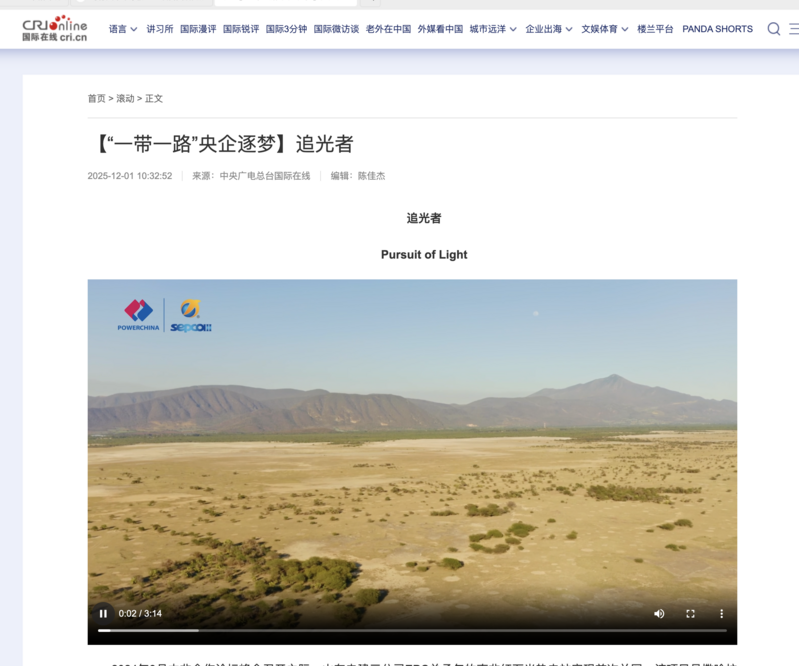 2024年9月中非合作论坛峰会召开之际,山东电建三公司EPC总承包的南非红石光热电站实现首次并网,该项目是撒哈拉以南非洲首个塔式熔盐光热电站,意义重大。山东电建三公司自制人物专访视频《追光者》,讲述外籍职工代表Thaphelo Kgosiejang与同事携手“点亮”南非的故事。 During the September 2024 Summit of the Forum on China-Africa Cooperation, the South African Redstone Concentrated Solar Power (CSP) Plant, EPC-general contracted by PowerChina SEPCOIII, successfully achieved its first grid connection. As the first tower-type molten salt CSP plant in sub-Saharan Africa, the project carries great significance. The company produced a self-made interview video titled Pursuit of Light, which tells the inspiring story of Thaphelo Kgosiejang, a representative of foreign employees, and his colleagues working together to "light up" South Africa. The video not only showcases individual dedication but also highlights the project's pivotal role in driving local economic development and improving people's livelihoods. 链接:https://news.cri.cn/20251124/44ecb63f-5e32-470a-9d95-dd74270dc8a4.html | |||||||||